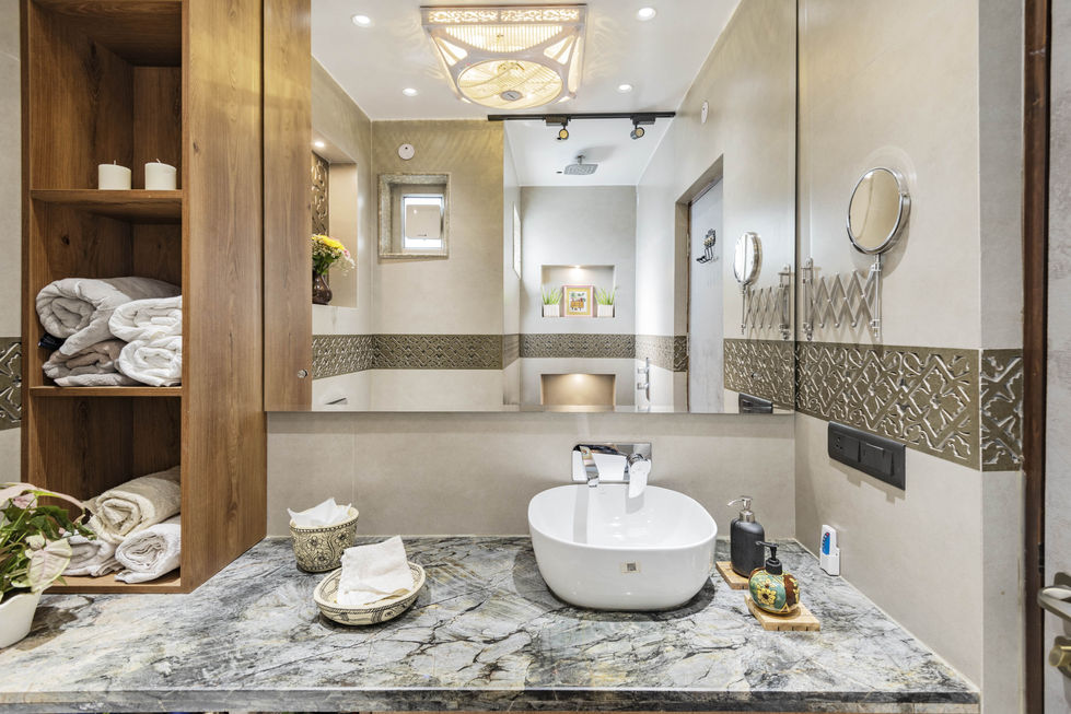 This minimalist house, perfect for a modern couple, maximizes space with slim false ceilings and pocket slider doors. Interiors feature a neutral palette, teal veneer accents, and CNC-tiled bathrooms for a hotel-like feel. An open kitchen and powder-blue lobby infuse warmth and style.